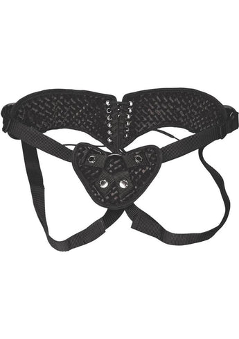 Give your partner the pleasure they need with the Lux Fetish Diamond Velvet Strap-On Corset. Features a comfortable, secure velvet harness, 4-way adjustable straps that fit hips up to 60", and a perfectly placed bullet vibe pocket for endless clitoral stimulation. This harness can accommodate any dildo with a flared base, and includes 2 rubber holder rings.