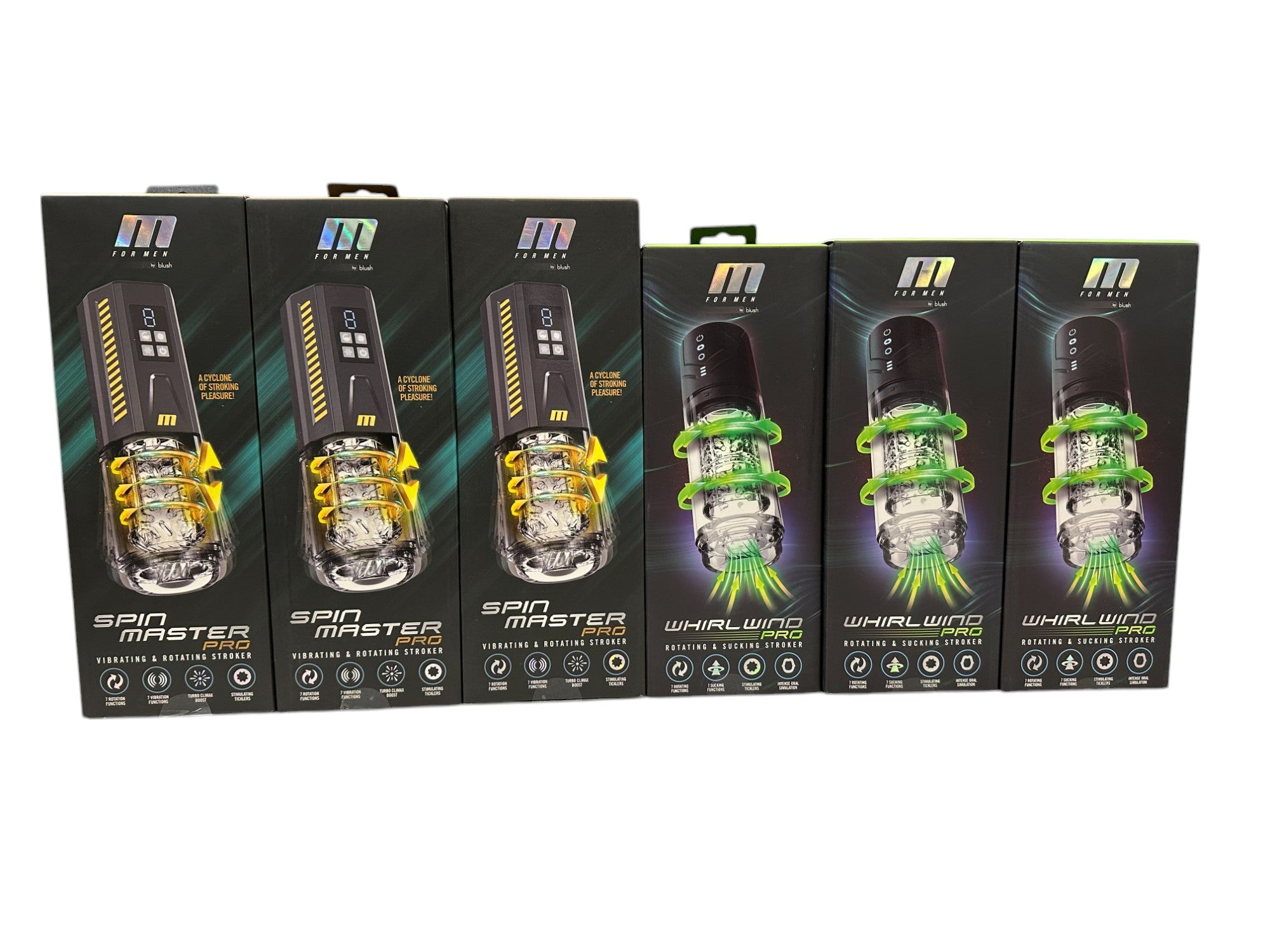 M FOR MEN AUTO MERCHANDISING KIT From BLUSH Contains 5 Spin Master Pro Vibrating & Rotating Stroker and 5 Whirl Wind Pro Rotating & Sucking stroker
