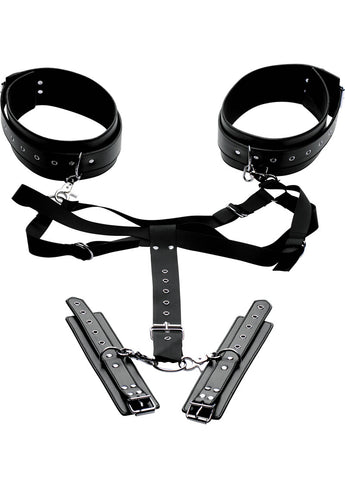 Your submissive lover wants to be even more vulnerable to your desires! Put them in this positioning harness to spread their legs open and keep their wrists trapped behind their back. Four points of adjustability allow you to customize the chest harness to your partners size. The elegant ankle and wrist cuffs are also fully adjustable with the buckles. This comfortable positioning aid can be used during foreplay or sex to pleasure your pet… and yourself!