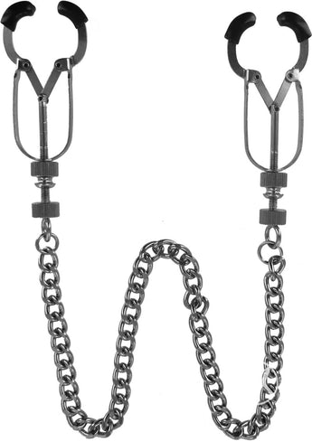 Designed for precision and strength, the Bauhaus Nipple Vice comes to you with two clamps that can be adjusted to your desired level of tightness with the adjusting screws located at the base. The tips are covered in soft TPR with the addition of a delicate curve at the very end that assists in gripping the skin of your subject. Ending this commanding piece is the addition of a 12 inch connecting chain that looks oh so enticing as it hangs from the captive nipples of your plaything.