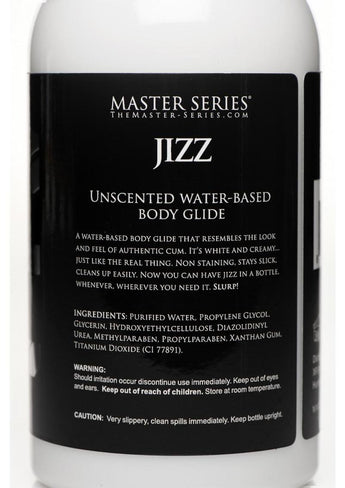 Love the texture and look of cum? Play with our Jizz Body Glide and enjoy using it in sensual play! The creamy white texture is made from a water-based mix and it is unscented so you can enjoy the look and feel without any lingering scents! It is super slippery, so you can slip and slide over each other as you massage each other's bodies. As a bonus, even if it spills it is non-staining! It stays slick, but because of the water-base it cleans up easily with soap and water. Ingredients included are generally body safe but do include glycerin, so it is not recommended for internal use. Keep away from children and keep at room temperature in an upright position.