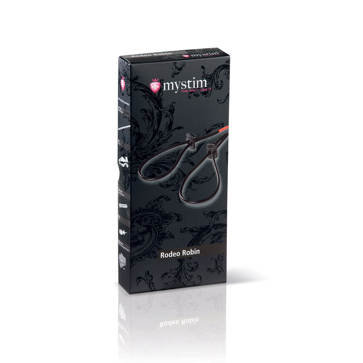 The Mystim Rodeo Robin is a strap set perfectly suitable for an especially intense stimulation of penis and testicles and provokes a tingly, sensuous pleasure which can either lead you quickly to the most unexpected heights, or can be enjoyed for hours. Thanks to the fact that the straps are adjustable they can comfortably be sheathed, and afterwards adapted so that they are tight around the glans respectively root of penis or testicles. Please always connect the strap with the black wire to the area which is closer to the body: If you connect the glans and root of the shaft, connect the glans with the red wire and the root of the penis with the black one this will make the stimulation even more intense.