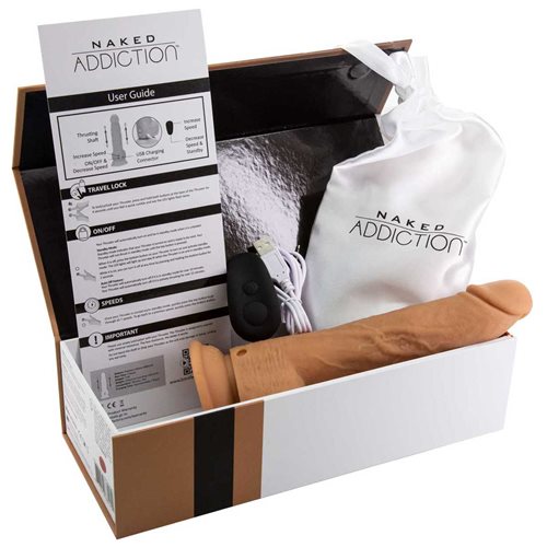 Naked Addiction 9 inches Caramel Thrusting Dong with Remote Control from BMS Enterprises. Introducing the Naked Addiction collection. With Incredi Feel technology, this superior Silicone has an ultra realistic feel. Unbelievably soft to the touch, yet firm where needed, you will be obsessed with the sensation it delivers. The Naked Addiction Thrusting dong is a luxury dildo with hyper realistic textures and veins in the material. With a strong suction cup base as well as a harness compatible design, this thruster offers unparalleled power. The highest setting on this Thruster is out of control! This Thruster includes a convenient remote control that can be used to increase or decrease the speed as well as enter standby mode. Key features: 100% Platinum cured Incredi Feel Silicone. USB Rechargeable. Remote Control. Multi-speed, Multi-function. Independently controlled vibrations and rotations. Thrusting Shaft. Incredibly strong. Realistic texture. Harness compatible. Strong suction cup. Phthalate free. Latex free. Easy to clean. Water resistant. Dimensions length 9 inches, 6 inches insertion length. Diameter 1.80 inches. Shown with Brown Dildo is the package image. Also shown with a strap on harness, not included. Sold separately. Categories: Rechargeable Vibrators, Dildos, Dongs, Realistic Dildos, Dildos and Dongs Realistic. Restricted, Amazon Restricted. 2023.