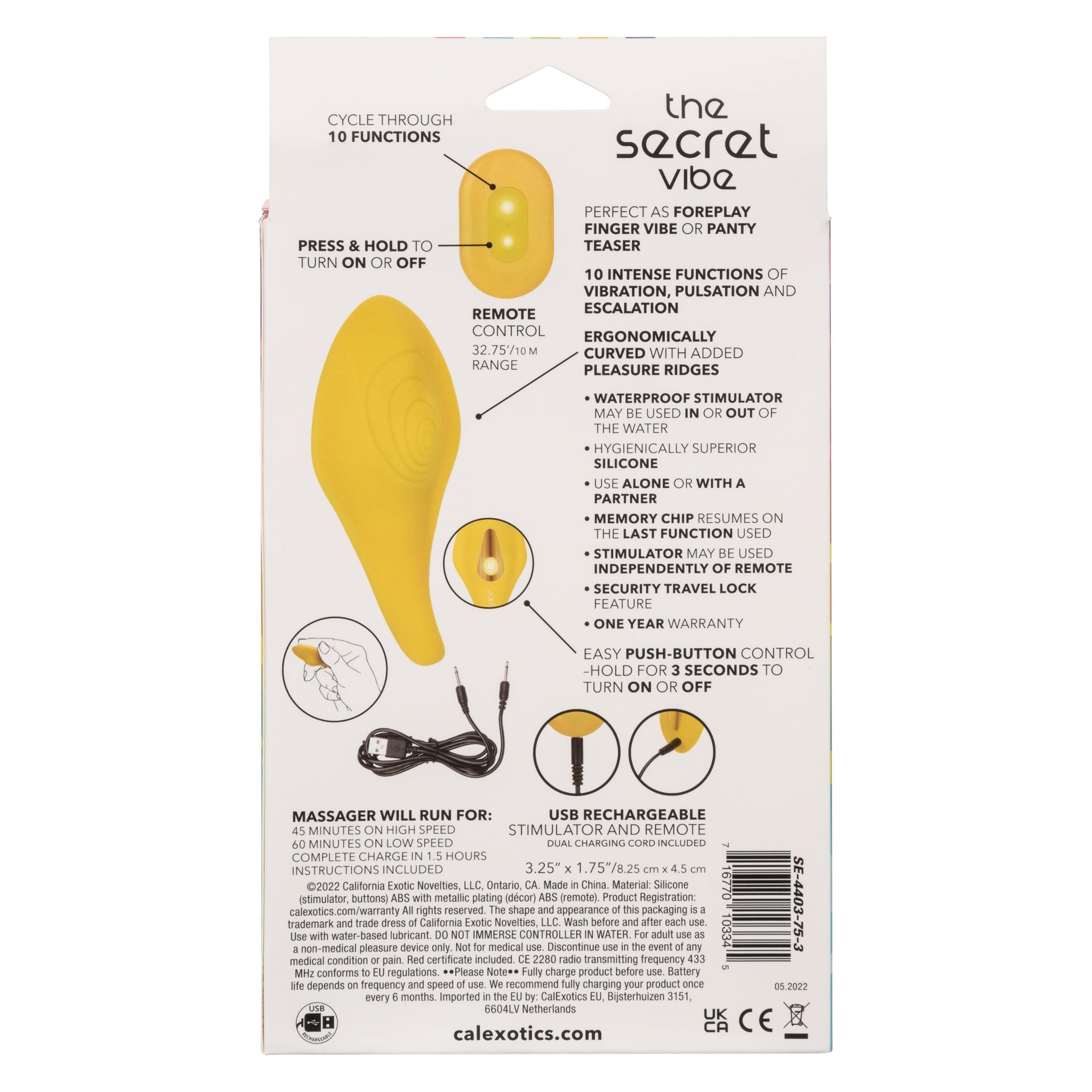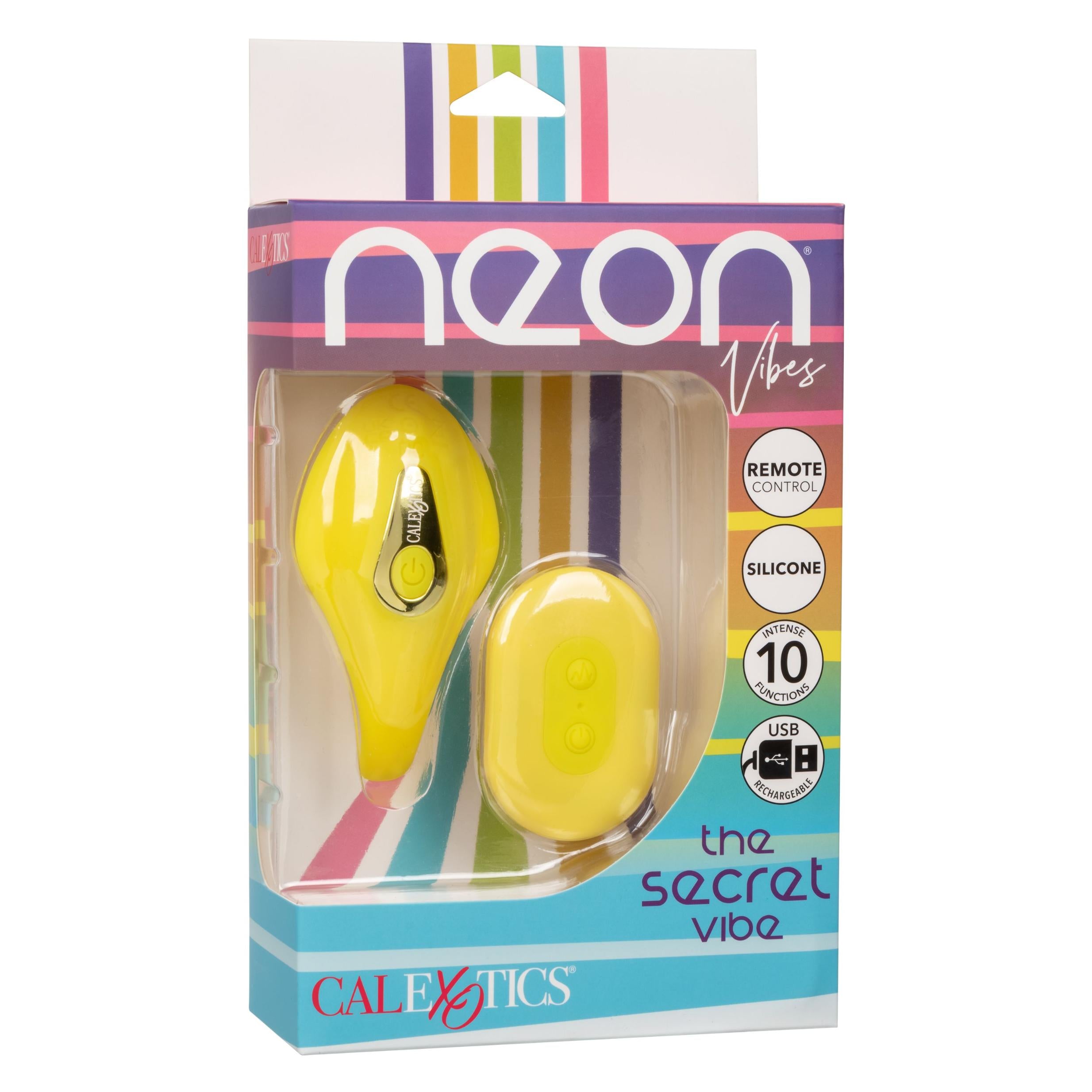 Neon Vibes The Secret Vibe Yellow Pleasure Toys from California Exotic Novelties. The Neon Vibes The Secret Vibe puts knee shaking pleasure at your very fingertips with a handy remote control! The ergonomically curved remote controlled vibrator is sure to thrill with pinpoint stimulation and full coverage vibrations. The playful vibe indulges your every fantasy with 10 functions of vibration and a unique multi-use design for versatile play with an easy to use remote control. The contoured shape and ultra plush Silicone are made to explore sensual sweet spots and pinpoint intimate desires with ease. Turn the heat up on foreplay with the teasing versatile shape that can be used as a finger vibe, panty teaser, and so much more. The discreet mini remote control makes it easy to enjoy adventurous foreplay. Once fully charged, the versatile panty teaser has an orgasmic controller range of up to 32.75 feet away! Get playful with up to 60 minutes of stimulation with every charge. Charge up your passion in only 1.5 hours by plugging the provided USB cable into the self sealing charging port on the back of the massager and the remote. The massager's discreet size makes it the perfect travel companion, letting you embrace radiating pleasure wherever your fantasies take you.