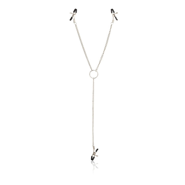 Nipple Play Triple Intimate Clamps from California Exotic Novelties includes 3 fully adjustable multi-use clamps. Enjoy 3 times the orgasmic erotic fun with the Nipple Play Triple Intimate Clamps. The versatile multi-use fetish play clamps are designed for arousal, stimulation, and ultimate satisfaction. Choose your pleasure hot spots and attach the easy grip clamps for intense sensations and thrilling tingles. The clamps are made from non-tarnishing, Nickel free Iron and comprise of three mini clamps attached via a sturdy high quality body jewelry chain. Each clamp measures 2.25 inches by 1 inch is fully adjustable for your sensitive teasing, and features soft, comfortable phthalate free PVC pads and easy twist screws. The triple chain provides decorative adornment and the added pleasure factor of stimulating weighted pleasure.Explore your wild side by satisfying your pleasure/pain curiosity. The clamps are perfect for sensual nipple and genital attachment and can also be used on other super sensitive areas of the body. To maximize the tantalizing experience, use a quality lube or arousal gel with the clamps. Before and after every use, clean the clamps with a toy cleaner spray. Soft, comfortable pads. Sturdy high quality dual chain for added sensuality. Non-tarnishing, nickel free. Safe and pure for body and pleasure made using phthalate free materials. Nickel free Iron chains, clamps, PVC pads. 2.25 inches by 1 inch each clamp. 26.5 inches overall length. Bulk weight 2.5 ounces. Categories: Bondage, Fetish, Kink, Nipple Play, Sex Toys for Women, Bondage Kits, Kinky Sets. 2023.