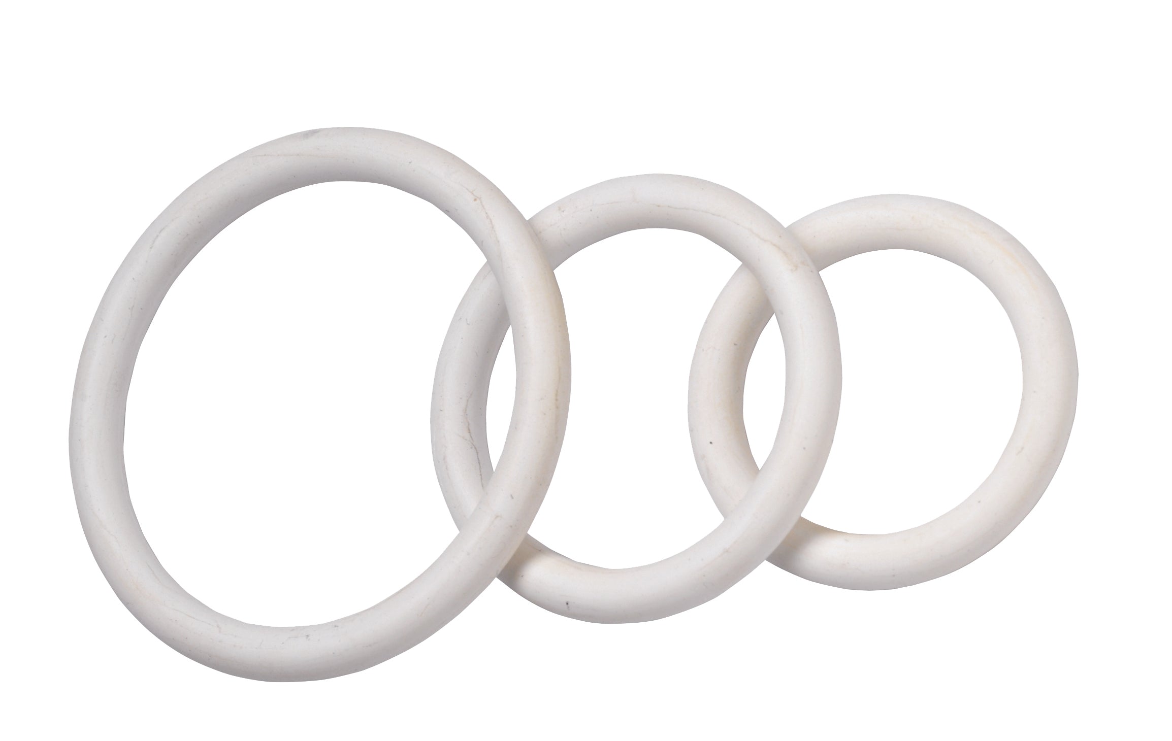 Nitrile Cock Ring Set is available in five colors: Black, Blue, Purple, Red and White Each sold separately. 3-pack of different sized rings. These amazingly durable cock rings are made of 100% skin-safe nitrile, the same material used in hospital gloves. Nitrile cock-rings are strong yet flexible, snapping back to shape after each use. Nitrile is a latex-free, strong and flexible material. Because it is latex-free, nitrile is a preferred cock ring material for men with rubber allergies. And not to worry, they are compatible with silicone & water-based lubes! Set includes 1.25 inches, 1.5 inches and 2 inches. Nitrile Cock Ring White Set from Spartacus A Passion For Quality Catalog page 21. Made in the USA.