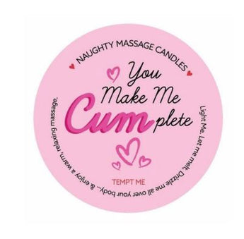 Naughty gift that keeps giving. Sexy wax free soy massage candle for warm, melted pleasure at your fingertips. Includes the following cheeky saying in sweet Tempt Me fragrance: “You Make Me Cumplete”. TSA approved travel size. Made in the USA.