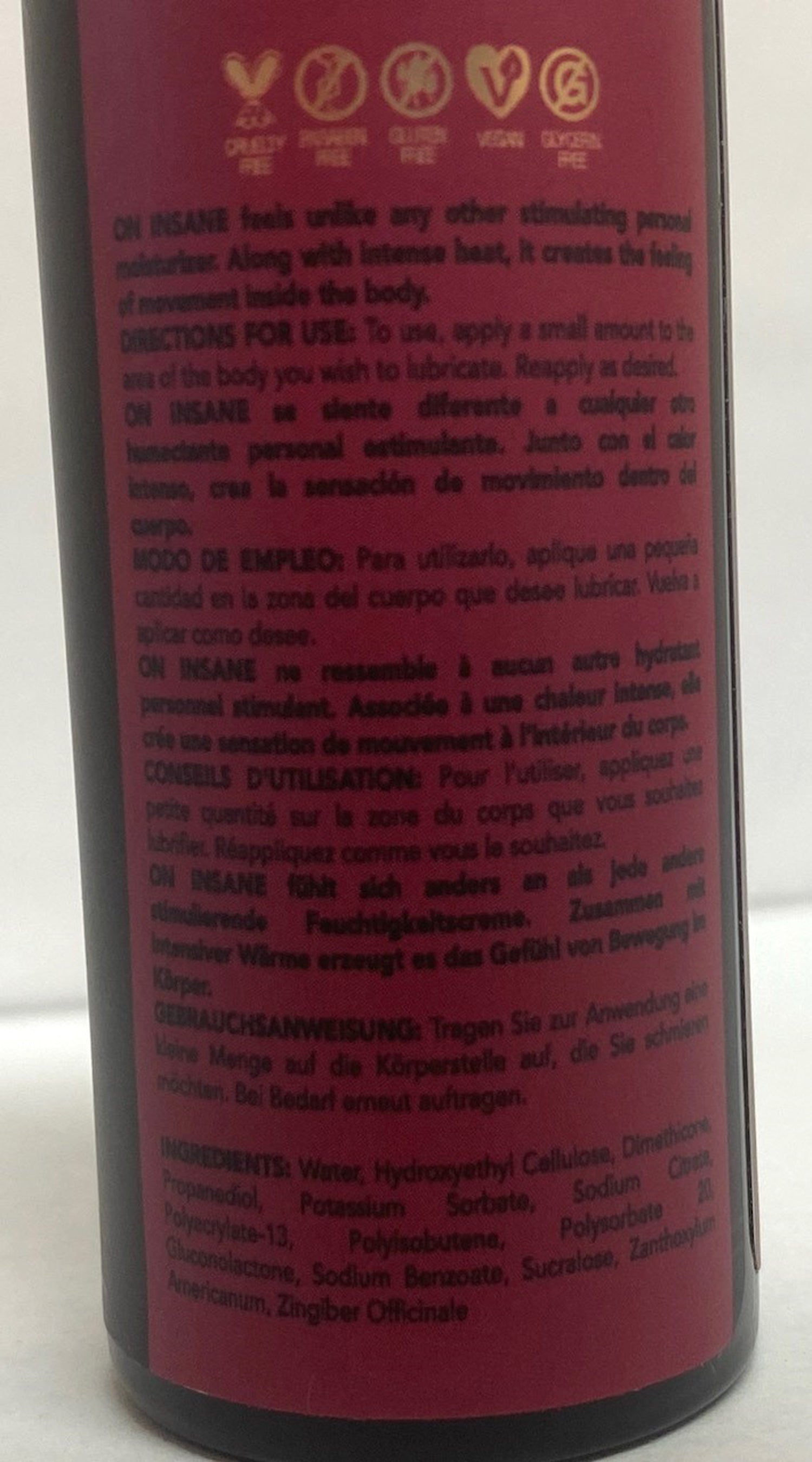 Colorless when applied. ON INSANE feels unlike any other stimulating personal moisturizer you’ve ever tried. Along with an intense warming feeling, it creates the feeling of movement inside the body. Women can feel an intense sensation using it externally as well. SHAKE WELL before use.