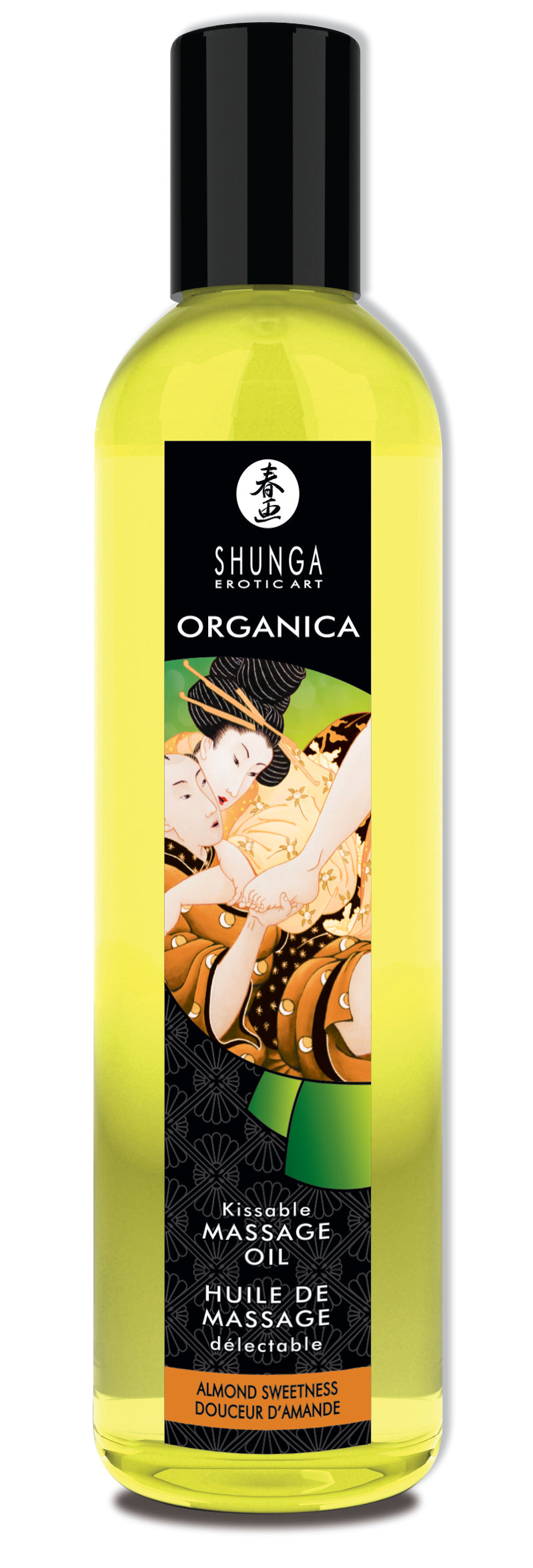 Organica Kissable Massage Oil Almond Sweetness from Shunga Erotic Art. This Kissable Massage Oil features a blend of certified organic refined vegetable oils infused with the succulent flavor of almond sweetness. So heavenly and natural you will want to eat it. So silky to the touch your hands will delicately glide over your lover's skin in gentle caresses, all for the pleasure of touching and being touched. 100% certified organic ingredients, 100% natural cold-pressed oils, Non greasy, Won't clog pores and Contains no mineral or animal oil. Pour a small amount into the palm of your hand and rub your hands together to bring the oil to body temperature. If desired, you can heat the oil in hot water for an even hotter touch. Ingredients (I.N.C.I.): Cold Pressed Sunflower Oil, Rapeseed Oil, Grape Seed Oil, Sesame Oil, Avocado Oil, Natural Vitamin E (Tocopherol), Flavor(Aroma).*Certified Organic. Latex Friendly, Vegan, Edible. Volume: 8 ounces/250 ml.