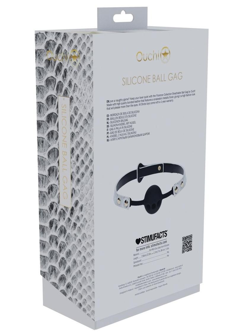 You love a naughty game? Keep you lover quiet with the Florence Collection Breathable Ball Gag by Ouch!. This gag has quality bonded leather adjustable straps for a one size fits all, and features an iridescent finish on its hardware, giving it a high fashion look that is sure to please more than the eye. Use this toy on its own, or in combination with other Ouch! products. All Shots toys come with a 1-year warranty.