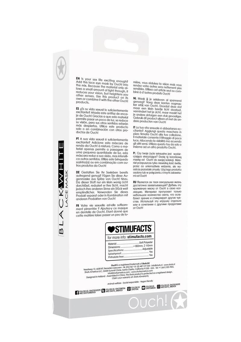 Is your sex life exciting enough? Add this lace eye mask by Ouch! into the mix. Because the material only allows a small amount of light through, it reduces your vision, but heightens you other senses. Use this product on its own or combine it with the other Ouch! products.