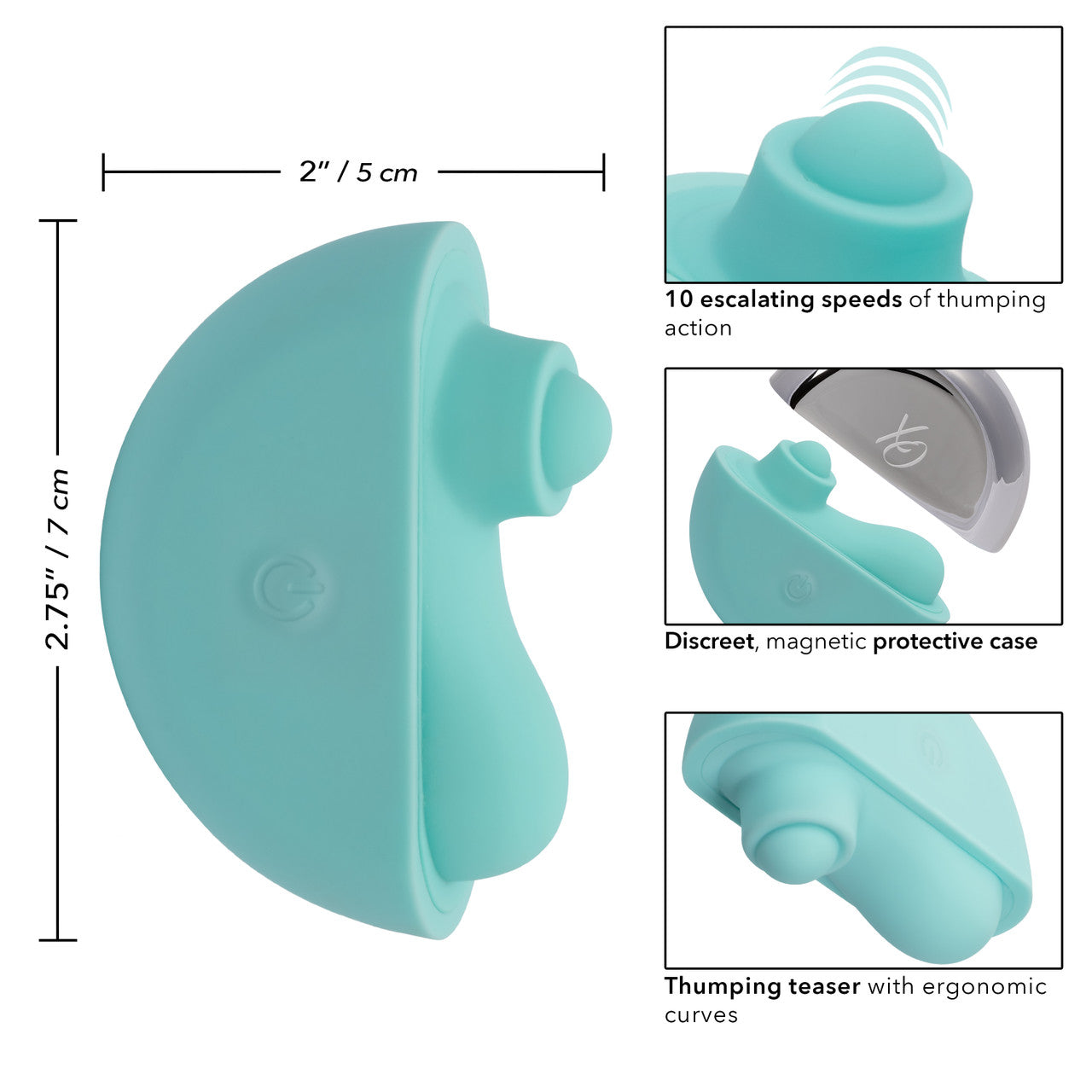 Ovation Acclaim Thumping Teaser from California Exotic Novelties. Experience intense pleasure with the Ovation Acclaim, a thumping teaser designed with ergonomic curves to stimulate all the right places. Enjoy 10 speeds of thumping action, allowing you to explore a range of pulsating sensations and find the perfect rhythm for your satisfaction. For discreet storage, the Teaser comes with a magnetic case that ensures privacy and protection. Crafted from body safe Silicone, it guarantees a comfortable and safe experience, prioritizing your well being during intimate moments. It is also fully waterproof and submersible up to IPX7 standards, allowing for sensual adventures in the bath or shower. Featuring a state of the art memory chip, the teaser remembers your last function, ensuring seamless continuation of your pleasure journey. Activate the security travel lock feature by holding the button for 3 seconds, providing worry free transportation. Stay powered up with the USB rechargeable feature, including a charging cord with magnetic contacts for convenience. A full charge in just 1.5 hours offers 45 minutes of high speed thumping or 70 minutes on low speed. Indulge in mind blowing pleasure with the Ovation Acclaim thumping teaser. Its ergonomic design, powerful thumping action, and user friendly features make it a must have for unparalleled satisfaction.
