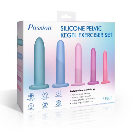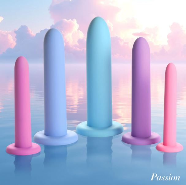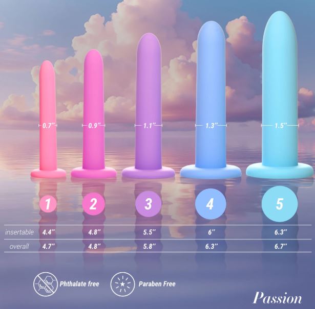 Features: Body-Safe Silicone: This body-safe, premium-quality silicone is silky smooth and glides right in with the help of some water-based lubricant. Graduated Sizes: Work your way up from the smallest (Step 1) to the largest (Step 5) size as you gain confidence, strength, and control! Smooth and Tapered: Insertion is gentle and easy due to the tapered, smooth tip. Suction-Cup Base: Each item can be used hands-free when you place the suction-cup base on a flat surface. Pelvic Dilators: This set can help those who experience pain during penetration. Use them to gently stretch your pelvic floor muscles and release tension. Measurements: Step 1: 4.7 inches overall length, 4.4 inches insertable length, 0.7 inches widest insertable diameter Step 2: 5.2 inches overall length, 4.8 inches insertable length, 0.9 inches widest insertable diameter Step 3: 5.8 inches overall length, 5.5 inches insertable length, 1.1 inches widest insertable diameter Step 4: 6.3 inches overall length, 6 inches insertable length, 1.3 inches widest insertable diameter Step 5: 6.7 inches overall length, 6.3 inches insertable length, 1.5 inches widest insertable diameter Materials: Silicone Color: Pink, purple, blue Note: Use only with water-based lubricants.