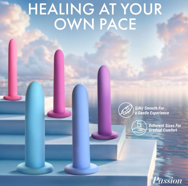 Introducing our premium-quality, body-safe silicone vulva dilator and kegal exercise set. Designed for gentle and comfortable use, each piece is made from silky smooth silicone that glides effortlessly with a touch of water-based lubricant. With five graduated sizes, this set allows you to build your confidence, strength, and control gradually, starting from the smallest size (Step 1) and progressing to the largest (Step 5). The smooth, tapered tip ensures easy insertion, and the suction-cup base lets you enjoy hands-free use on any flat surface. Perfect for those experiencing pain during penetration, these pelvic dilators can help you stretch your pelvic floor muscles and relieve tension effectively. They can be used to relax the muscles or, alternatively, you can squeeze them by doing kegels and strengthen the same pelvic muscles.