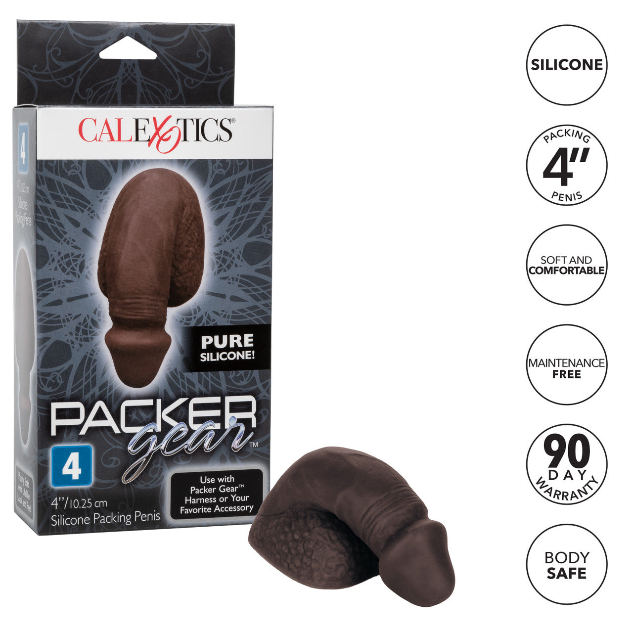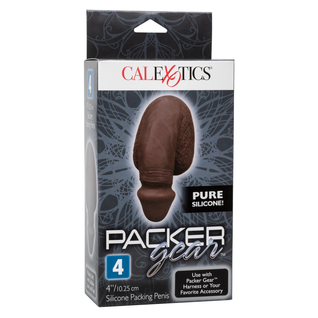 Packer Gear Black Packing Penis 4 inches Silicone from California Exotic Novelties.The sensual Packer Gear Packing Penis is a realistic male package that makes for a sexy and masculine look. Designed for a comfortable and secure fit in your favorite Packer Gear Harness, the super soft and pliable Packing Penis is ideal for anyone looking to show off these natural feeling goods. Made from ultra life like, unscented phthalate free Silicone material, the sculpted Packer Gear Packing Penis measures a natural length, features realistic skin folds and a textured Scrotum. The Packing Penis is maintenance free and it has a uniquely designed base that securely fits into the super stretchy reinforced O-Rings of comfort fit Packer Gear Harnesses. Enjoy a new level of masculinity and confidence with the Packer Gear Packing Penis. Uniquely designed base for secure fit in Packer Gear Harness or your favorite accessory. Soft and comfortable, the perfect Packing Penis. Ultra life like skin material. Maintenance free. Safe and pure for body and pleasure. Made using phthalate free materials Silicone. Bulk weight 5.8 ounces. Measurements: 5 inches by 3.25 inches overall. 4 inches by 1.5 inches Penis. Bulk weight 5.8 ounces. Package 6.3 ounces. Package: 2 inches by 4 inches by 8.5 inches. Categories: Dildos, Dongs, Realistic Small, Medium, Fleshlight and Packers, Dildos and Dongs Realistic. 2023.