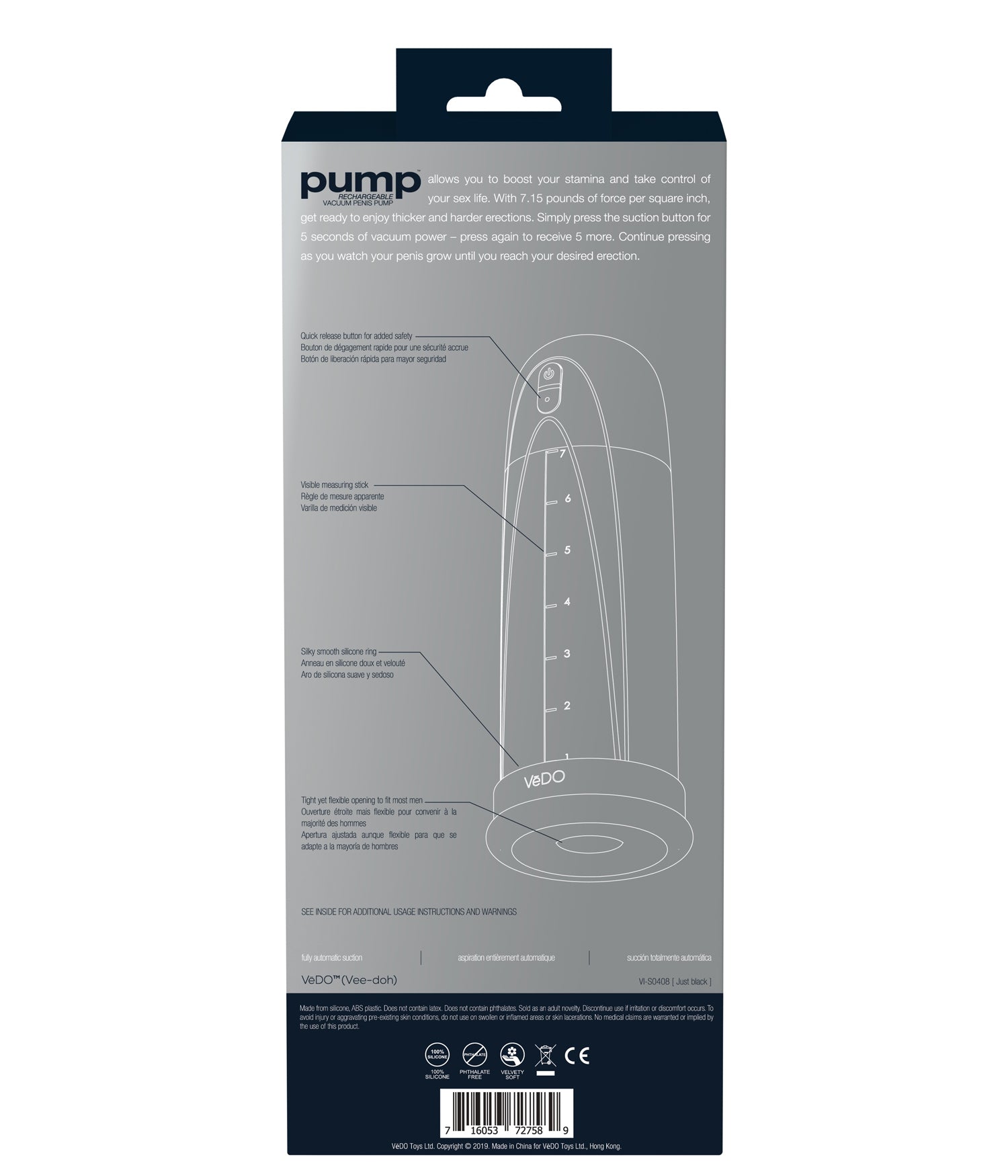 Pump allows you to boost your stamina and take control of your sex llife. With 7.15 pounds of force per square inch, get ready to enjoy thicker and harder erections. Simply press the suction button for 5 seconds of vacuum power - press again to receive 5 more. Continue pressing as you watch your penis grow until you reach your desired erection.