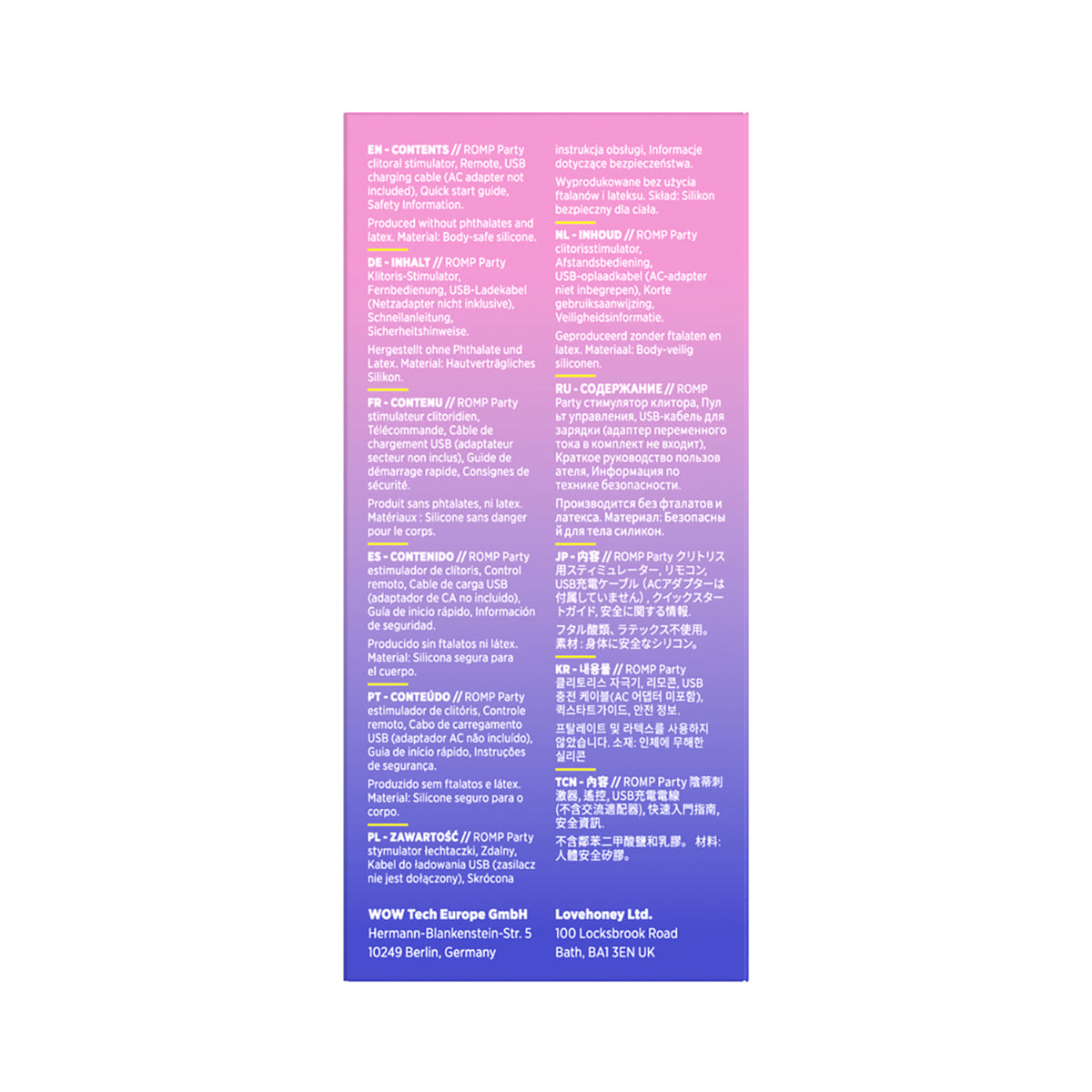 - Box includes: ROMP Party, Quick start guide, Safety instructions, Stickers, USB charging cable (AC adapter not included)