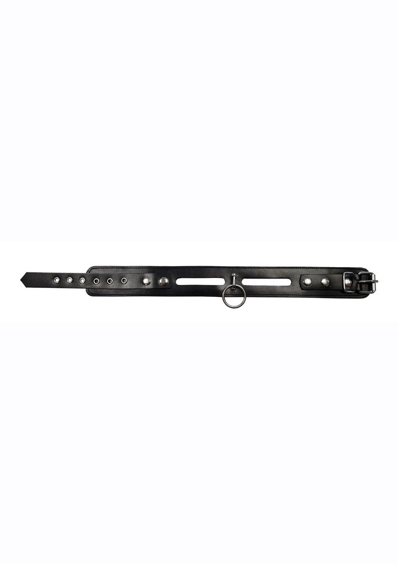 This sexy leather collar is comfortable yet sturdy, perfect for keeping your submissive under control by adding an attachment to the O-ring. Ideal for bedroom bondage, fetish parties or on its own as a stylish collar. Features an extra layer of softer leather on the inside and will soften more with use. With a 6-hole buckle closure that adjusts between 14.5 b 18.5 inches, perfect for men and women.