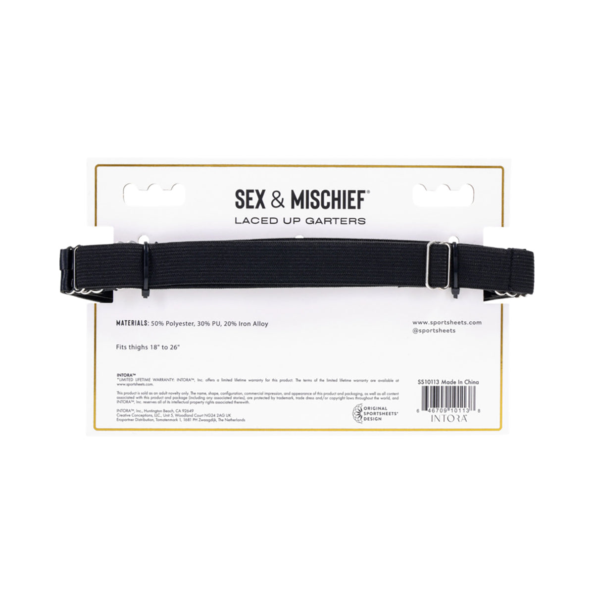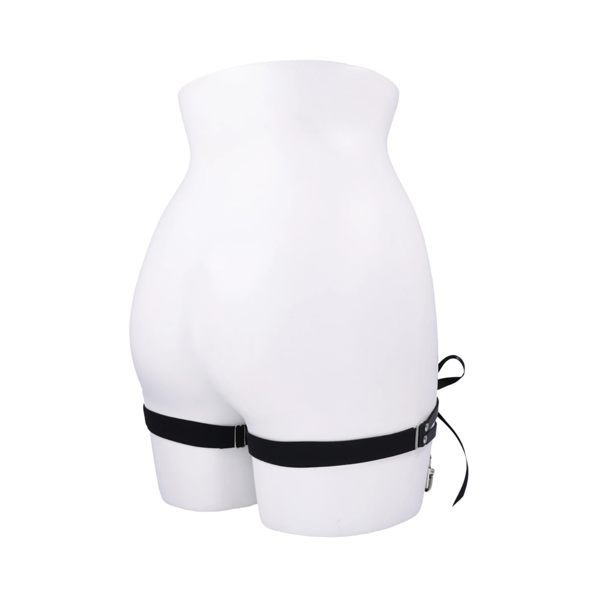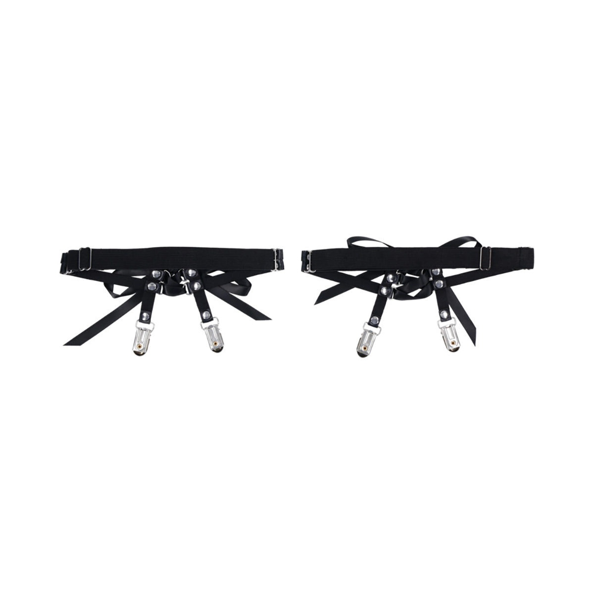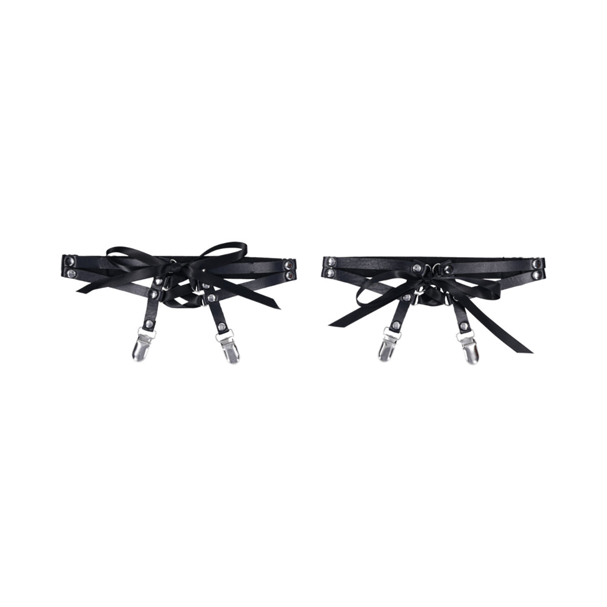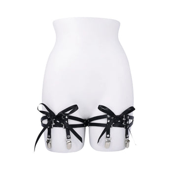 Turn heads and capture hearts with these flirtatiously elegant garters, featuring a sultry lace-up corset design. Black satin ribbon weaves through the faux leather panels, offering an adjustable fit that contours your thighs with seductive precision. A secure clip keeps your thigh-high stockings perfectly in place, while the fusion of bold structure and soft satin strikes the perfect balance between edgy and romantic. Designed to make a statement, the Laced Up Garters empower you to embrace your daring side and indulge in moments of sensual confidence.