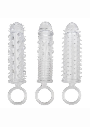 The 3 Piece Extension Kit is a set of 3 tight, close-end extension sleeves with a ribbed texture inside and out for intense stimulation. These enlarging enhancer sleeves wrap tight to increase girth, length and explosive pleasure for everyone involved. The erotic enhancer is tipped with an accentuated solid penis head and reservoir tip that delivers an extra 1” of pleasure.