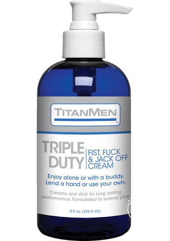 Great for both partner and solo play, TitanMen Triple Duty Fist, Fuck & Jack-Off Cream is the ultimate multi-purpose glide to satisfy all your sexual needs. The premium formula starts off creamy, and turns nice and slick upon usage, for a long-lasting performance that only finishes when you do.