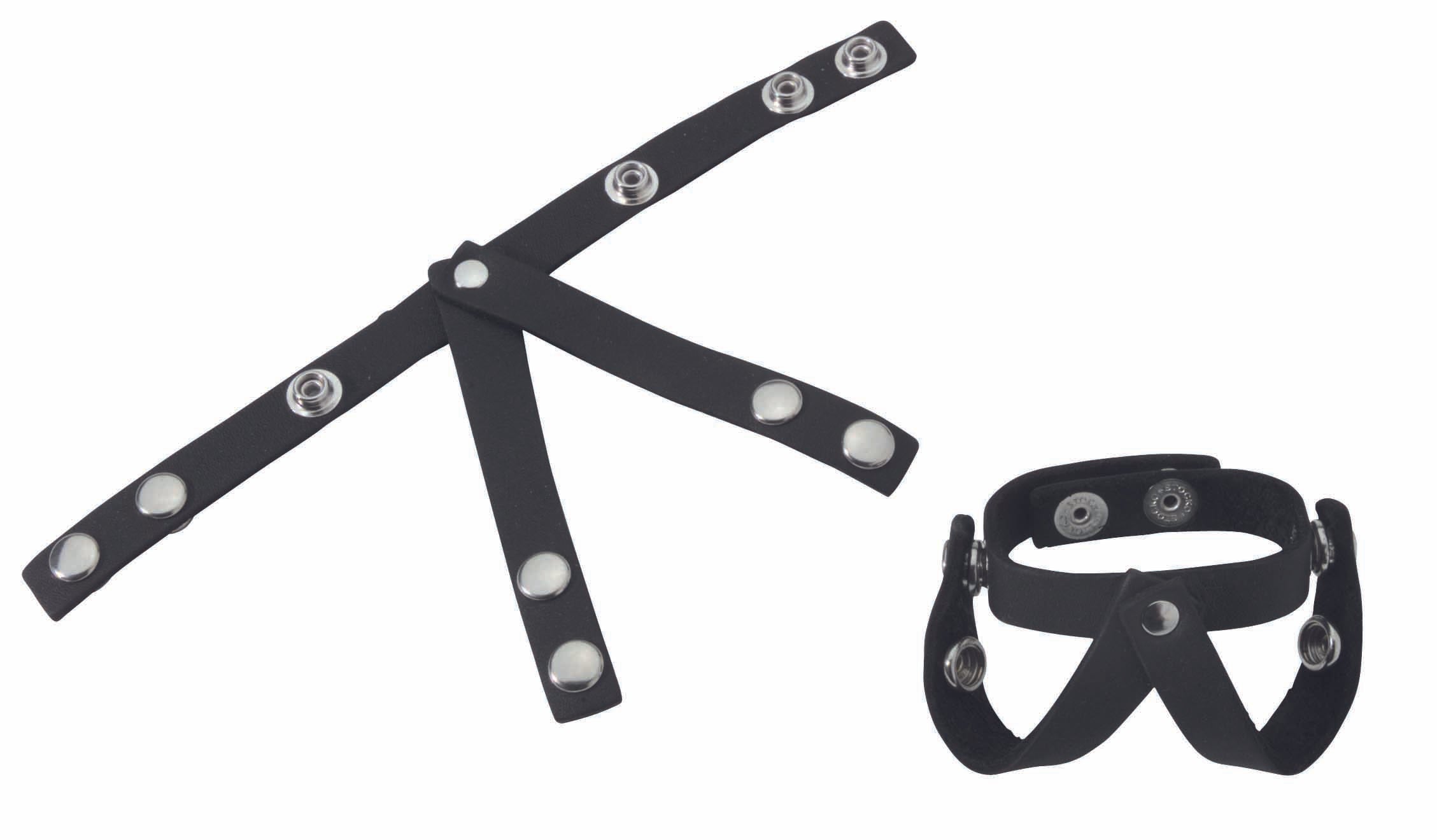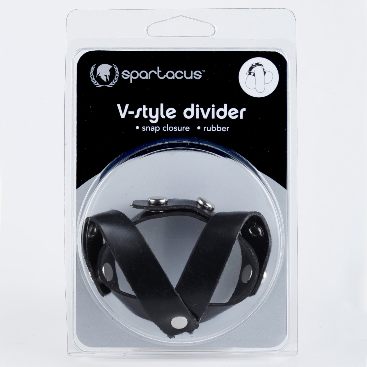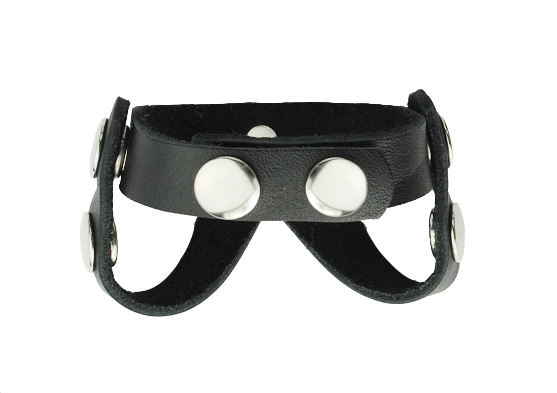 Spartacus Leathers Cock Gear Black V Style Cock and Ball Divider. Discover all the sexy sensations of leather. They have combined style and pleasure in this attractive V style divider. A V Style divider firmly separates the testicles, while also providing the pleasurable effects of a cock ring. Snap closures. Adjustable. Easy to use just snap in place. Spartacus A Passion For Quality Catalog. Made in the USA.