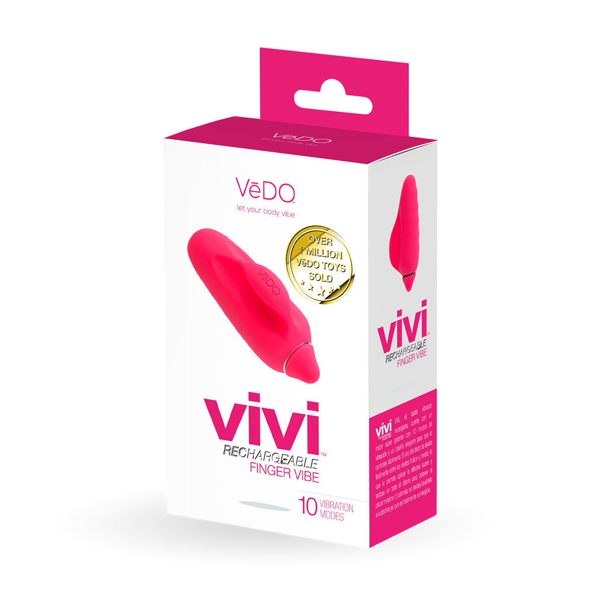 Vivi rechargeable finger vibe boasts a super powerful motor with 10 vibration modes and a sleek design for effortless control. The ergonomic finger handle easily fits between the index and middle fingers, allowing easy maneuverability with the silky smooth, ribbed silicone over all the most sensitive areas. Don't be afraid to jump in the tub - Vivi is completely submersible!