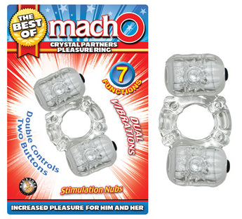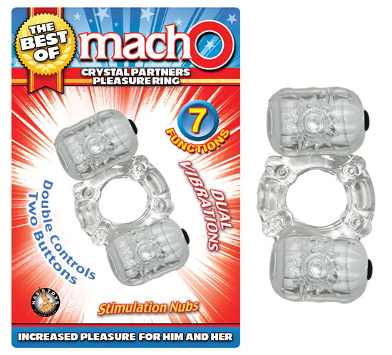 (WD) The Best Of Macho Crystal Partners Pleasure Ring Clear features 7 functions. Dual vibrations. Double controls. Two buttons. Vibrations switch automatically! Increased pleasure for him and her. Stimulation nubs. Waterproof vibrations. Body safe phthalate free ROHS compliant materials cock ring sleeve SEBS silicone, bullet vibrators ABS plastic. Size overall length 3.875 inches, diameter 1.625 inches. Battery information: 4 LR1130 batteries required, included. 2 in each bullet vibrator. No longer available. 2023.