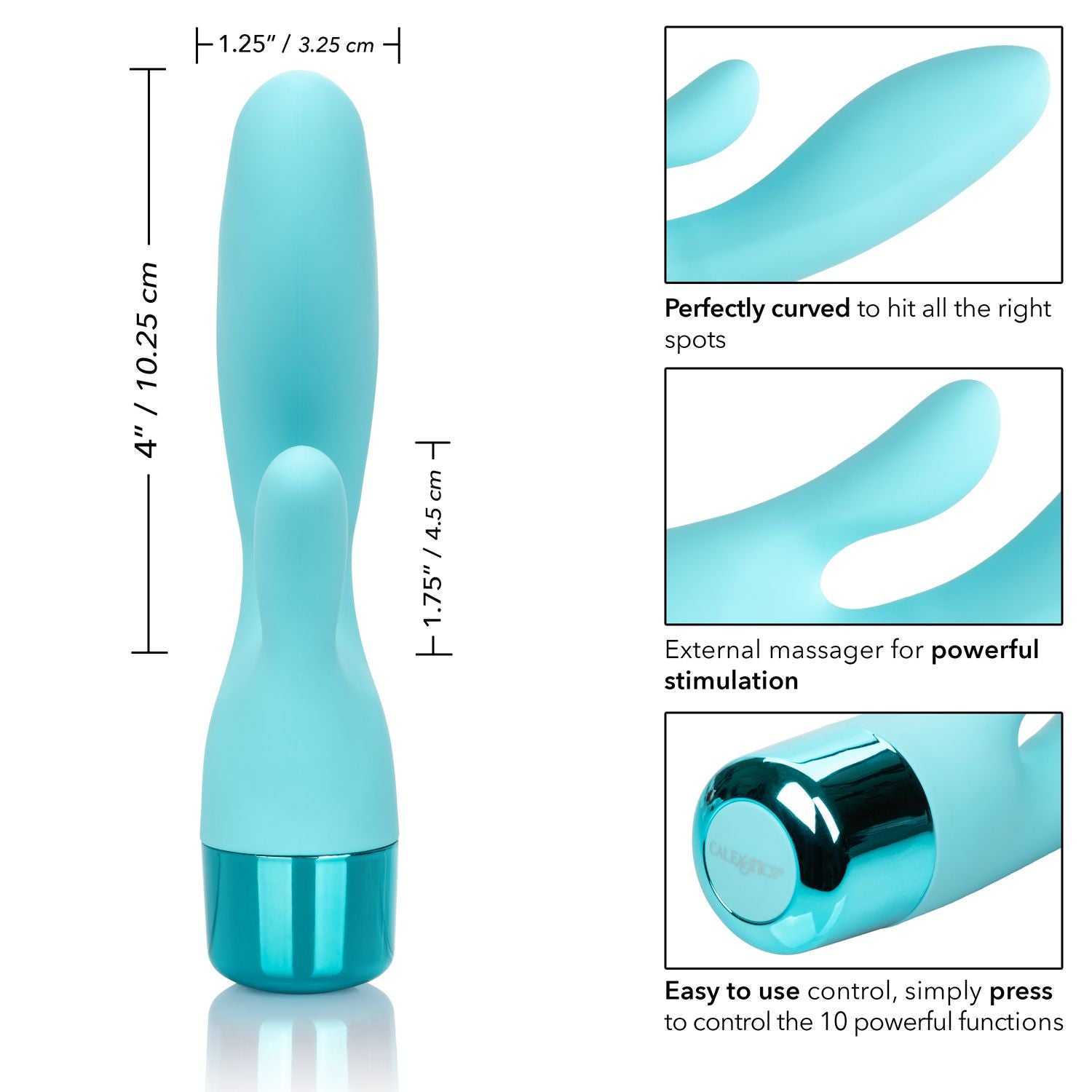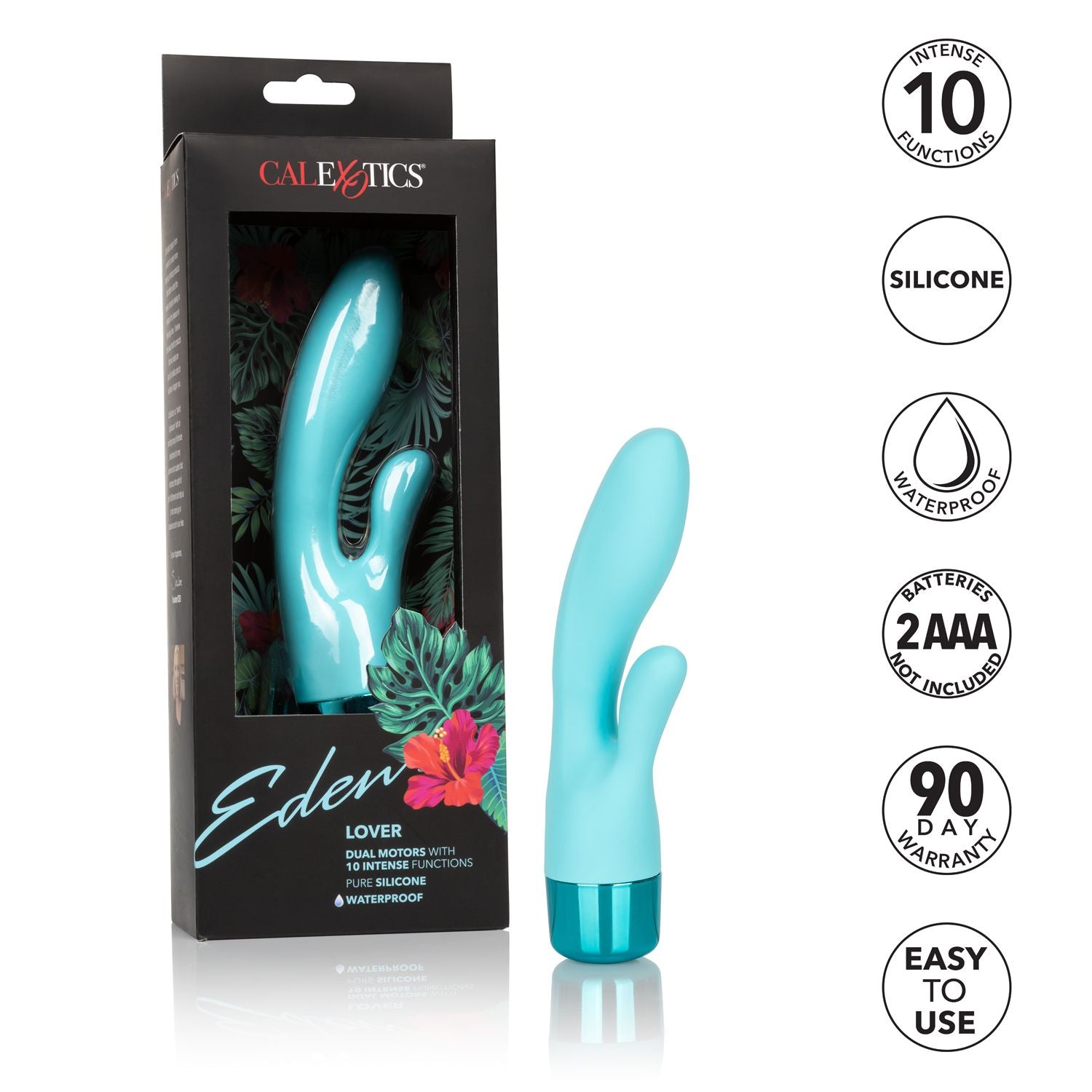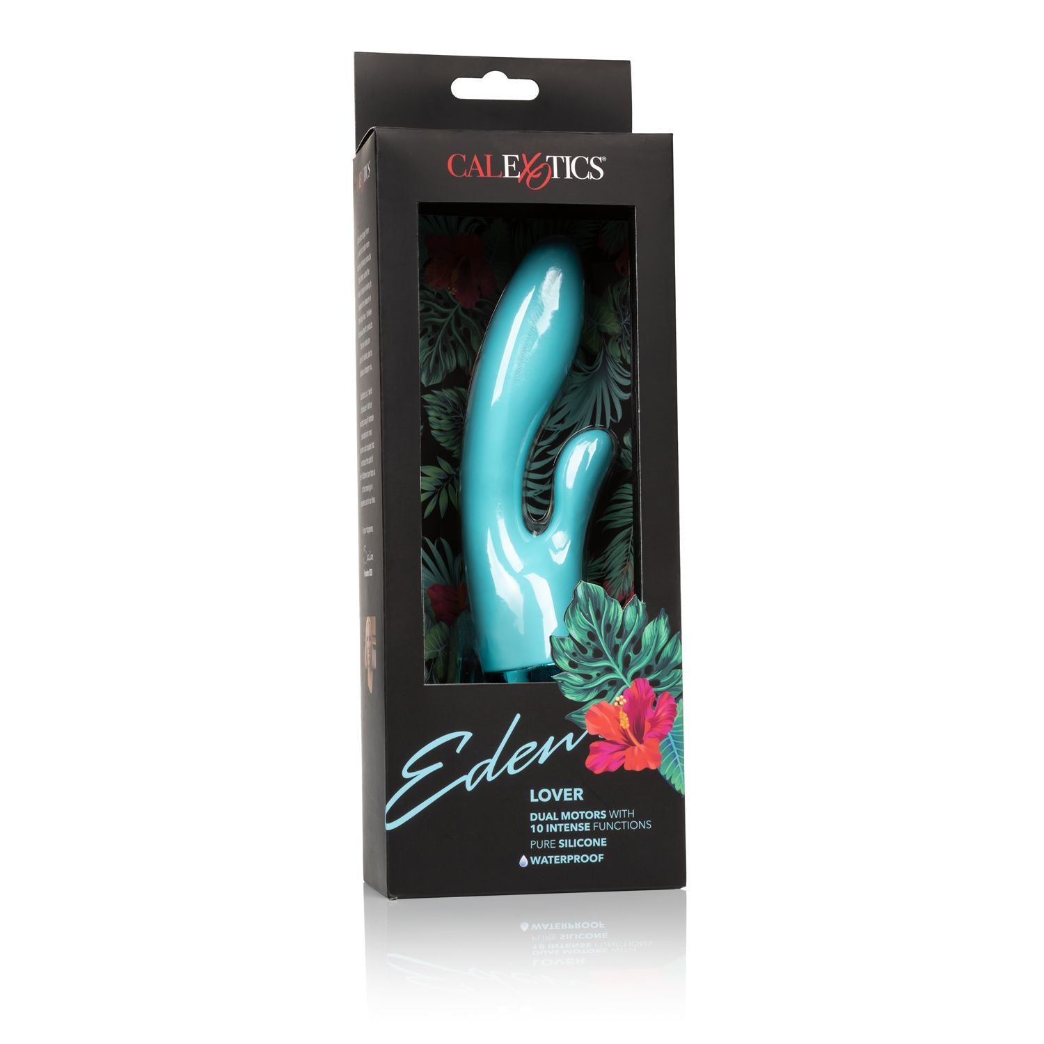 (WD) Eden Lover Green Rabbit Style Vibrator from California Exotic Novelties. Indulge in a pleasure paradise with the Eden Lover. This powerfully petite Rabbit Vibrator has an intense vibration motor, flickering Bunny tickler and 10 powerful functions of vibration. The contoured teaser tip and sensual Shaft are perfect for caressing internal and external sweet spots. For an ultra smooth surface and flexible body, the curved Stimulator and Massager are covered in a premium Silicone. Indulge in personalized pleasure while the massager pulses to the rhythm of 10 vivacious vibration, passionate pulsation and erotic escalation. Control this variety of orgasmic options with the easy touch control button. Whether you are taking a dip with a lover or indulging in a steamy solo session, look forward to up to hours of waterproof vibration. Power up your pleasure vibe with 2 AAA batteries. The flexible Massager is made from a hygienically superior Silicone. This body safe material is unscented and phthalate free to keep your most sensitive spots happy and healthy. Color Teal Green. Materials Silicone, ABS Plastic with Metallic Plating. Power source 2 AAA batteries, not included.