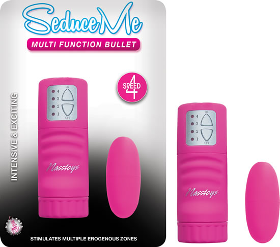 (WD) Seduce Me Multi Function Bullet Vibrator Pink features 4 speeds. Intensive and exciting bullet vibrator. Body safe, phthalates free RoHs compliant material ABS plastic. Size Bullet vibrator length 2.5 inches, circumference 3.25 inches, diameter 1.125 inches, controller length 4 inches. Cord length 30 inches. Vibrating bullet requires 2 AA batteries, not included.
