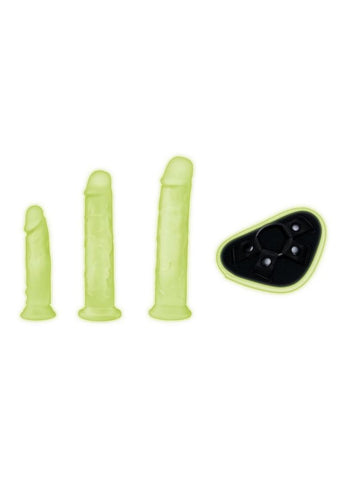 This glow-in-the-dark pegging set includes a fully adjustable strap-on harness with a snap-on O-ring to secure one of the included three dildos in graduated sizes in place. The dildos are also fun to use by themselves.